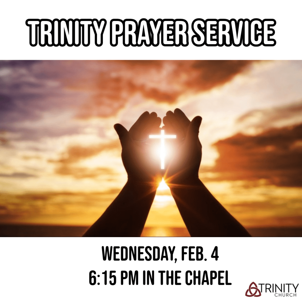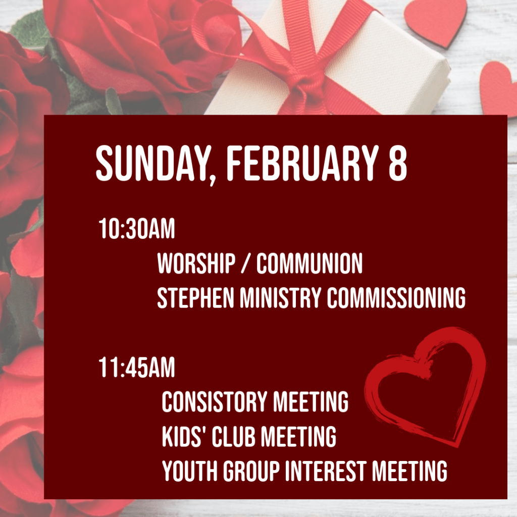 | 8 9:30a – Sunday School 10:30a – Worship 11:45a – Consistory Mtg. 11:45a – Kids’ Club Meeting 11:45a – Youth Group Meeting | 9 | 10 11:45a – Combined Good Timers’ & Singles’ Luncheon 5:30p – B of Property Mtg. 5:45p – Trinity Foundation Mtg. | 11 6-8p – Youth Open Gym 6:30p – A.A. Mtg. 7p – Choir Practice | 12 9:30a – Hugs & Stitches 6p – Sweet Adelines’ | 13 | 14 Valentine’s Day |