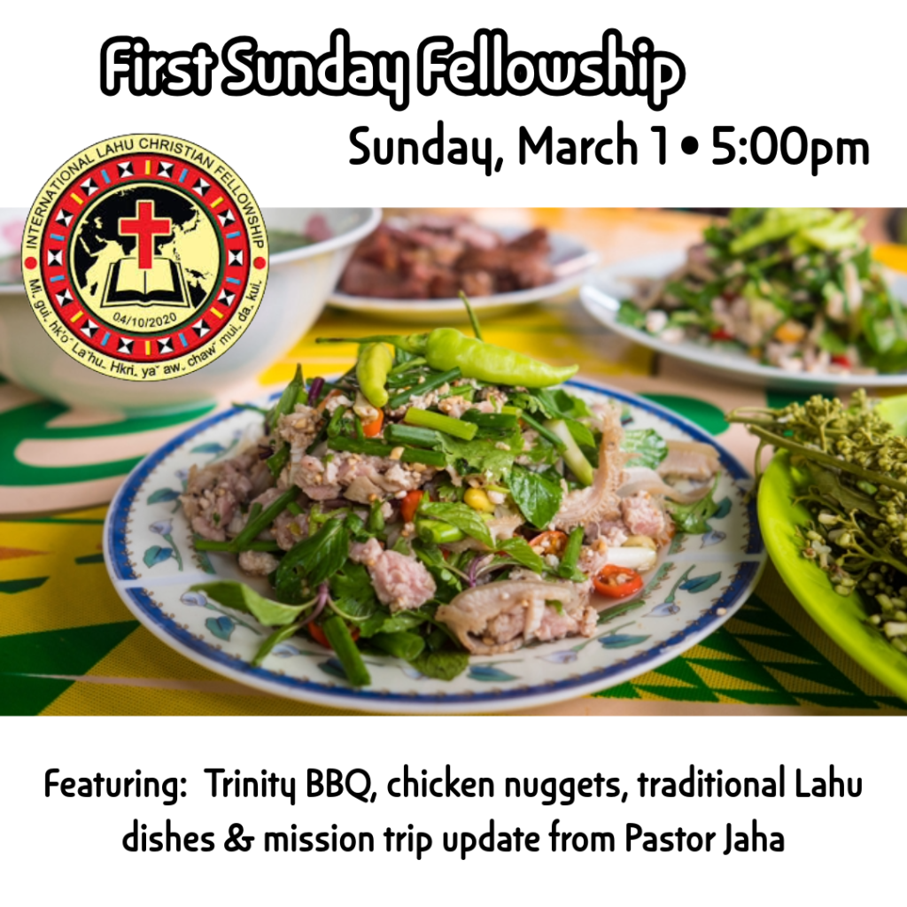| 1 Second Sunday in Lent *Begin ASHURE Food Drive 9:30a – Sunday School 10:30a – Worship 11:30a – Brotherhood Mtg. 5p – 1st Sunday Fellowship | 2 6p – Ladies’ Book Study | 3 6:30p – Men’s Book Study | 4 6-8p – Youth Open Gym 6:30p – A.A. Mtg. 7p – Choir Practice | 5 6p – Sweet Adelines’ | 6 | 7 |