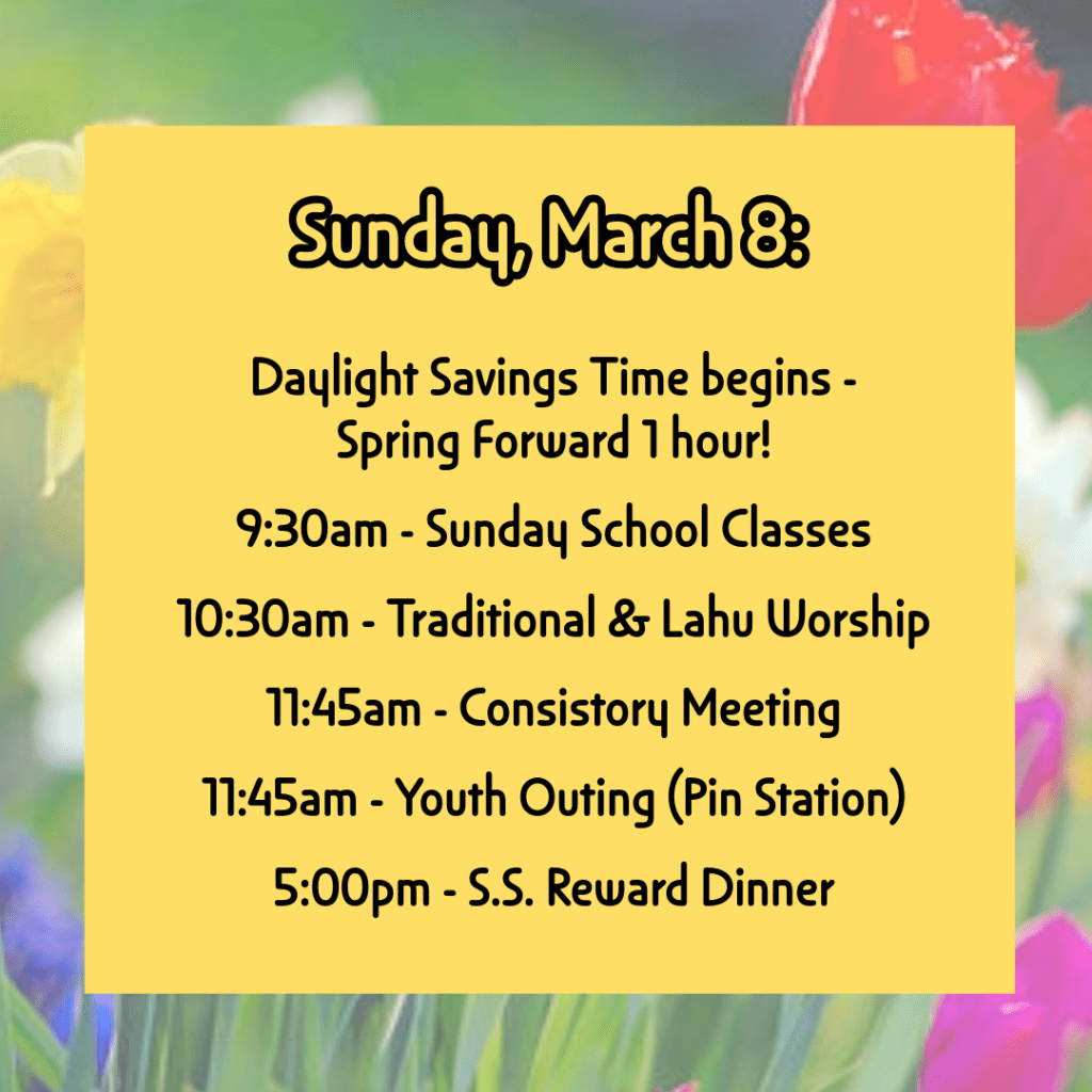 | 8 *Daylight savings time begins Third Sunday in Lent 9:30a – Sunday School 10:30a – Worship 11:45a – Consistory Mtg. 11:45a – Youth Outing 5p – S.S. Reward Dinner | 9 *Easter Lily Orders Due 6p – Ladies’ Book Study | 10 5:30p – B of Property Mtg. 6:30p – Men’s Book Study | 11 6-8p – Youth Open Gym 6:15p – Trinity Prayer Mtg. 6:30p – A.A. Mtg. 7p – Choir Practice | 12 9:30a – Hugs & Stitches 6p – Sweet Adelines’ | 13 | 14 *Work Day at JRVC (9a-4p) |